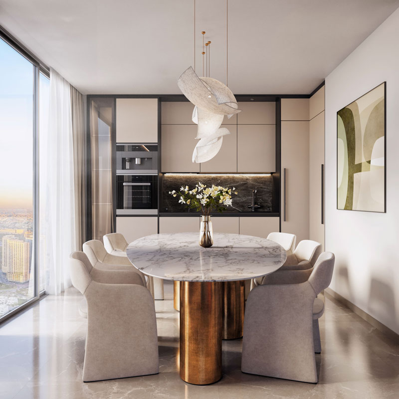 Thanks to its unique location, residents can quickly reach Dubai’s key landmarks. Dubai International Airport and Al Maktoum International Airport are 24 minutes away, while Dubai Mall, Burj Khalifa, and Dubai Marina are 19 minutes away.