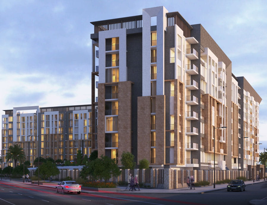 The complex includes a basement floors, a ground floor, 8 residential floors and a roof. This modern and stylish building features 608 apartments with different designs and sizes.