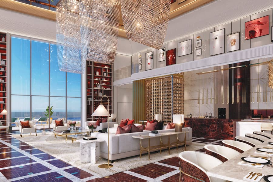 Safa Two is a luxury project by Damac, developed in collaboration with the renowned jewelry brand De Grisogono. The tower consists of a ground level, one podium level, and 68 residential floors. Its architecture is inspired by the elegance of precious stones, with a striking ruby-shaped structure adorning the facade. At the heart of the building lies a unique suspended pool with glass edges. The rooftop features an indoor fog forest, an observatory, and terraces offering panoramic views of Dubai Water Canal and Business Bay. The collection includes studios and one-, two-, and three-bedroom apartments, all designed in an elegant style that emphasizes comfort, functionality, and premium-quality materials.