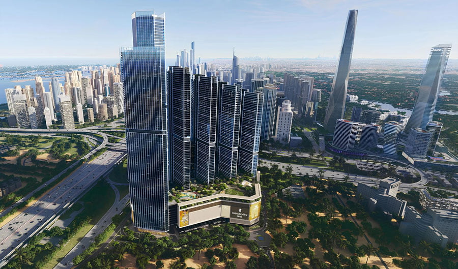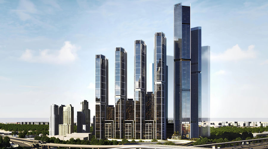 The Pinnacle at Sobha Central is a landmark project by Sobha Realty, located within the Sobha Central community. The tower comprises a ground level, thirteen podium floors, and ninety-four residential floors, rising with striking elegance. Its slender vertical form and glass façade create a powerful architectural statement on the skyline, offering panoramic views and projecting a sense of prestige and modern sophistication of the development.