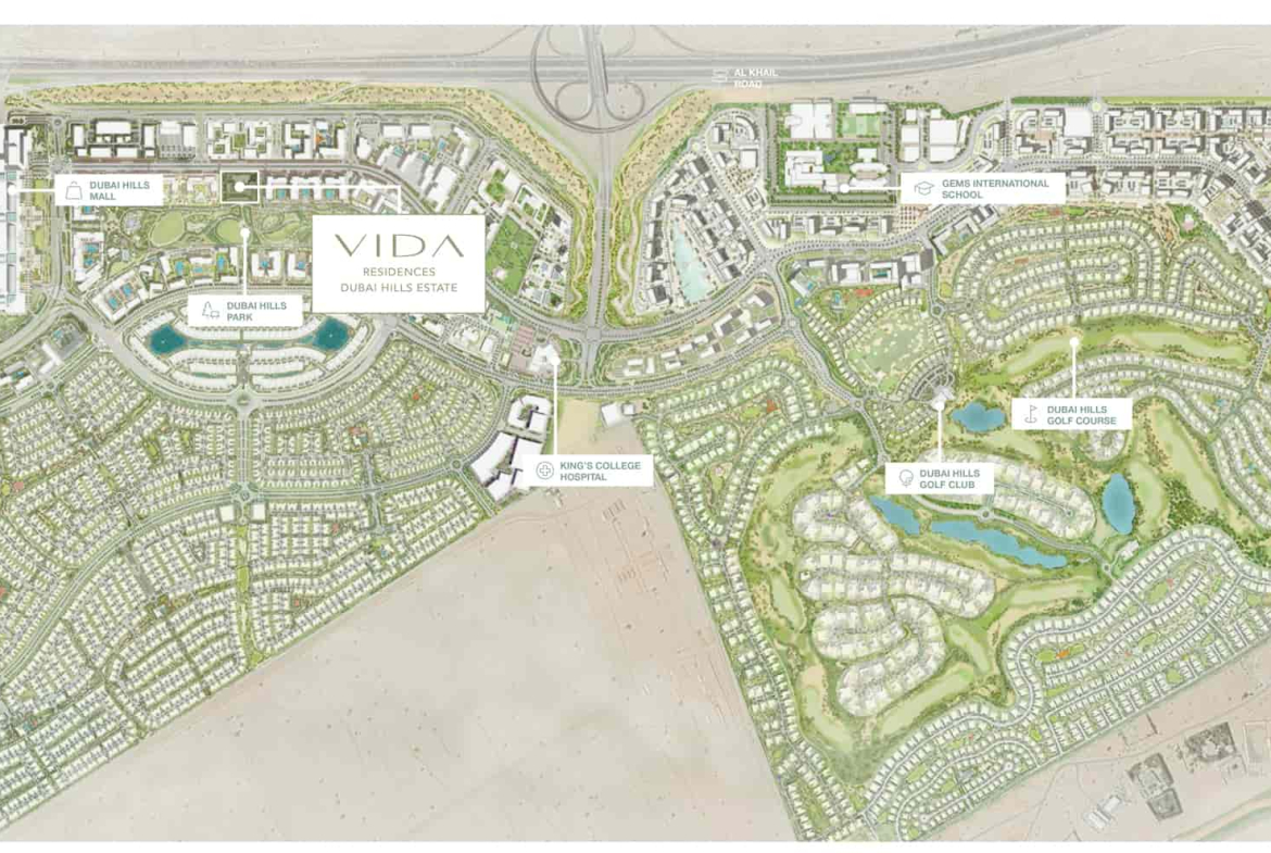 One of the features of Vida Residences Dubai Hills is its favorable location, thanks to which residents can quickly reach the key places of Dubai. Dubai Hills Business Park is just a 5-minute walk away, the mosque, Dubai Hills Mall and Dubai Hills Golf Club are within a 6-8 minute radius, and Downtown Dubai can be reached by car in 12 minutes.
